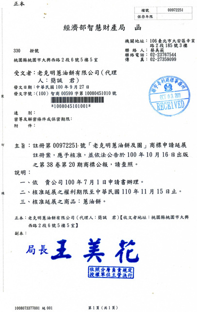 【老克明蔥油餅】有限公司 登記證【老克明】商標註冊證